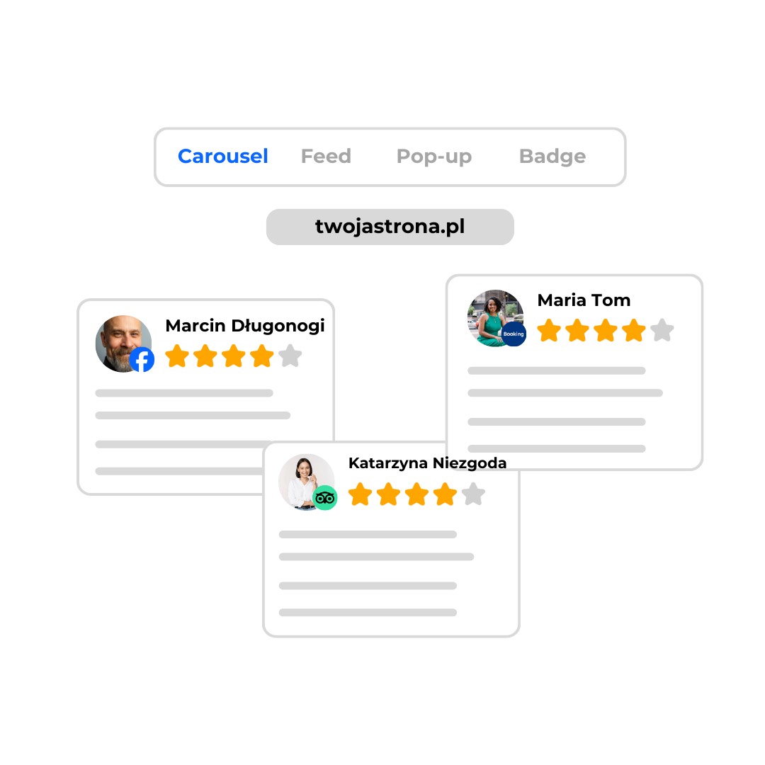 Zwiększ sprzedaż i zaufanie, prezentując najnowsze i najlepsze recenzje na swojej stronie internetowej w pełni automatycznie przy pomocy dodanego widżetu.